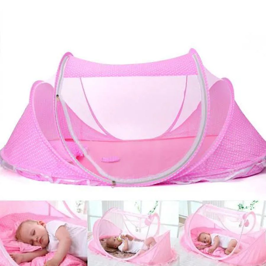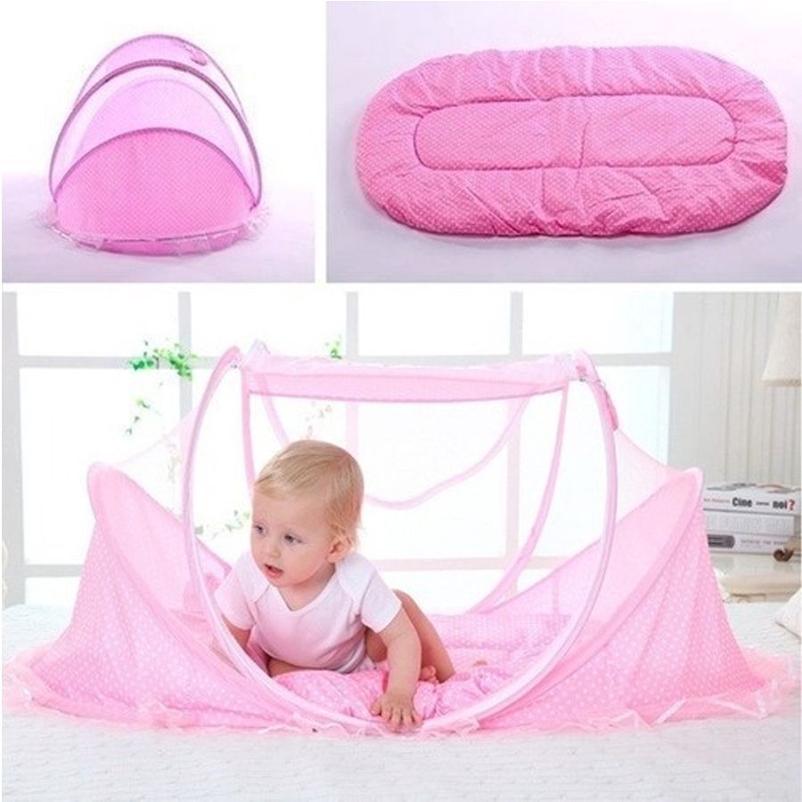 Um berço portátil com o véu de proteção para a mamãe não precisar mais se preocupar com mosquitos.