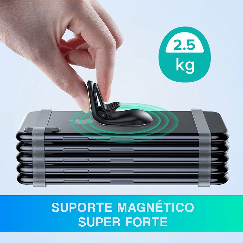 O Suporte Para Celular Magnético conta com qualidade e design com fino acabamento, tendo um campo magnético onde possui 5 poderosos ímãs, para melhor fixação do o aparelho ao suporte.